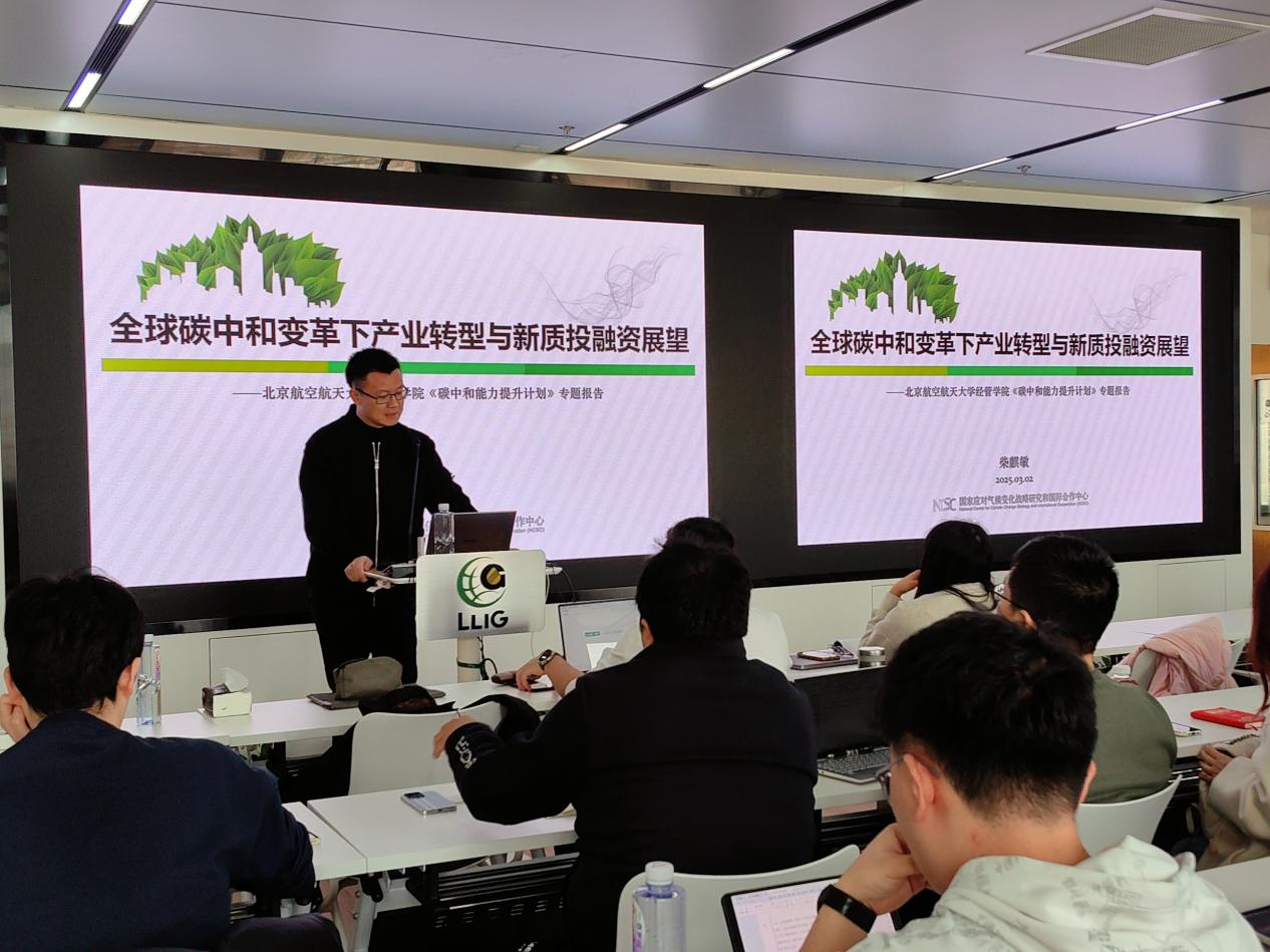 2025年3月2日,国家气候战略中心战略规划部主任柴麒敏研究员来到北航校园,主讲《全球碳中和变革下产业转型与新质投融资展望》专题讲座。经济管理学院院长、北航低碳治理与政策智能教育部哲学社会科学实验室主任范英教授主持报告会,北航师生五十余人参加了讲座。本次讲座是低碳实验室本研通识课程《碳中和能力提升项目》的重要一课。