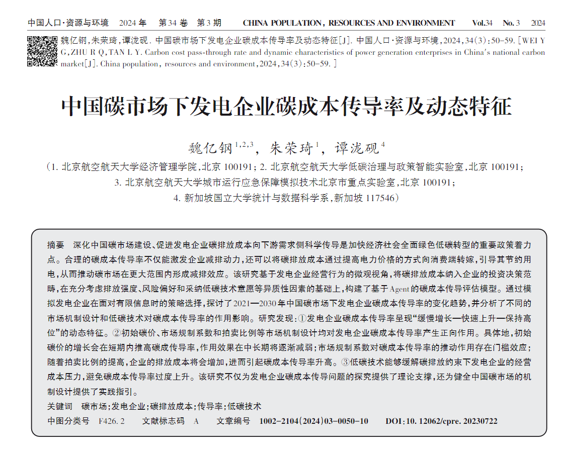 题目:中国碳市场下发电企业碳成本传导率及动态特征